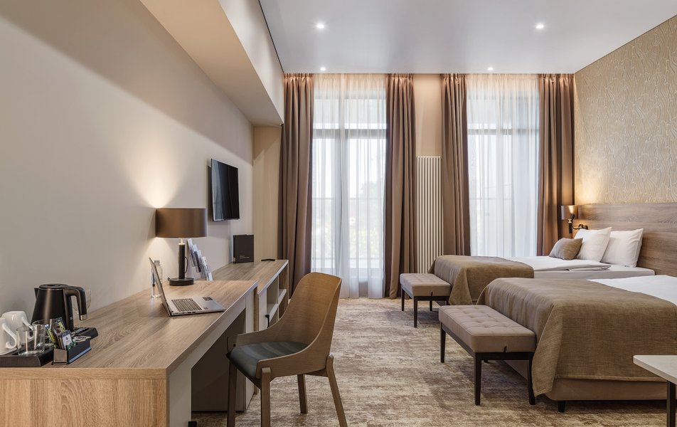 В номере: вешалка, зеркало, кровать двуспальная, прикроватная тумбочка, стол, тумба багажная, шкаф, мини-холодильник, сейф, телевизор ЖК, телефон, чайный набор посуды, электрочайник
