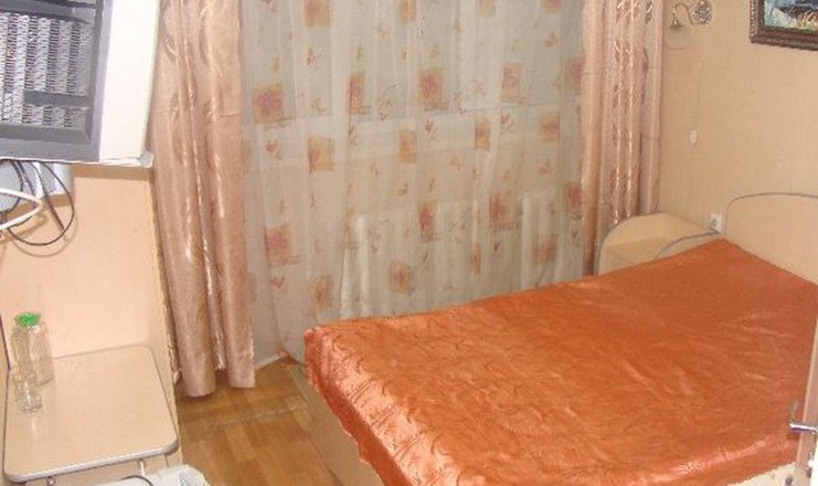В номере: зеркало, кровать полутороспальная, прикроватная тумбочка, стол, стулья, шкаф, мини-холодильник, телевизор, чайный набор посуды, электрочайник