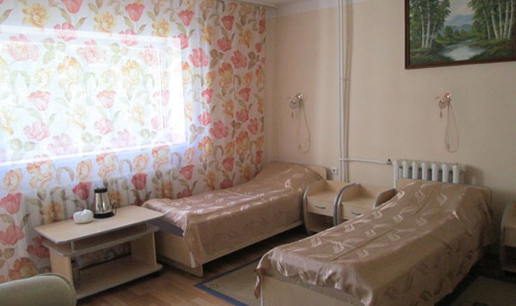 В номере: кресло, кровати односпальные, прикроватные тумбочки, стол, стулья, шкаф, мини-холодильник: на блок, телевизор, чайный набор посуды, электрочайник