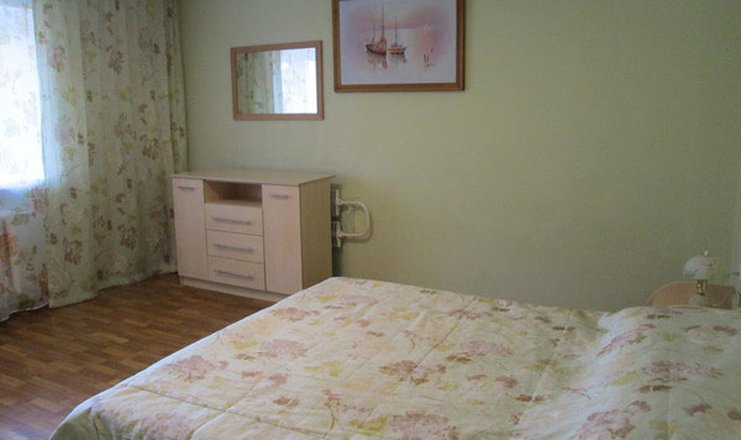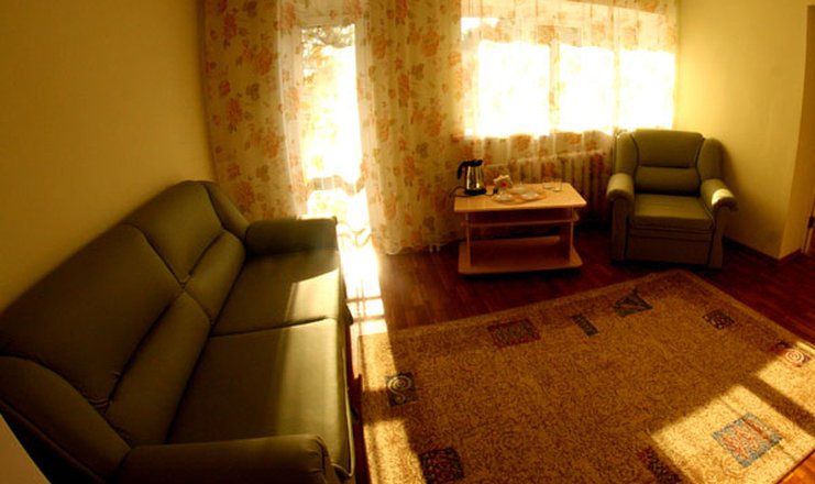 В номере: зеркало, кресло, кровати односпальные /одна двуспальная кровать, прикроватные тумбочки, стол, стулья, шкаф, телевизор, холодильник, чайный набор посуды, электрочайник