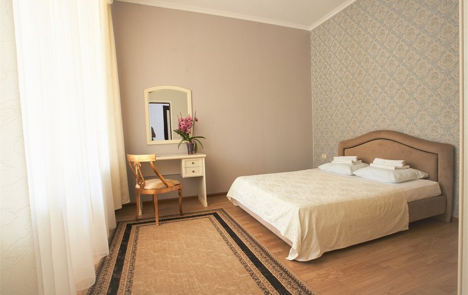 В номере: вешалка, зеркало, кресло, диван, кровати односпальные, двуспальная кровать, прикроватные тумбочки, стол, столик журнальный, шкаф, телевизор, телефон, холодильник, чайный набор посуды, электрочайник