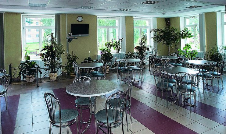 На территории санатория работает бар и столовая, также есть зона-барбекю с мангалом. В столовой предоставляется 5-разовое питание по системе «меню-заказ», разработаны специальные диеты по показаниям.